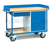 De wagen is voorzien van stalen kast, welke is gepoedercoat. De ombouw is grijs (RAL 7035), front blauw (RAL 5007). De kast heeft 1 vast legbord en 2 verstelbare legborden. De afmetingen van de kast zijn: 500 x 600 x 600 mm (BxDxH). Het draagvermogen per legbord is 30 kg. Daarnaast heeft deze werkplaatswagen ook een schuiflade met kogelagergeleiding en cilinderslot. De afmetingen van de lade zijn 105 x 410 x 475 mm (BxDxH). De wagen heeft geen tussenetage.