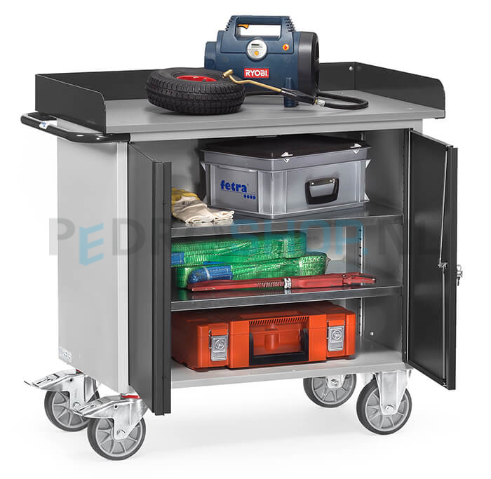 De werkplaatswagen heeft een kast met dubbele deuren zonder scheidingswand en is voorzien van 2 in hoogte verstelbare etages. De deuren zijn centraal afsluitbaar door middel van een cilinderslot. De deuren van de kast kennen een openingshoek van maximaal 120 graden. Het draagvermogen per etage is 80 kg.