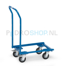 De wagen is gemakkelijk te besturen met de duwbeugel. De kopzijde van het frame tegenover de duwbeugel is open (zonder opstaande rand) waardoor eurobakken op- en afgeschoven kunnen worden. De wagen is voorzien van 4 zwenkwielen van TPE rubber, naaf met kogellager, waarvan 2 stuks met rem. Hierdoor voldoet de wagen aan de EU-norm EN 1757-3, de veiligheidsnorm voor platformwagens. De wagen wordt gedemonteerd aangeleverd.