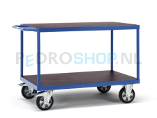 De Fetra 12402 tafelwagen in een stalen constructie met 2 etages die voldoende bescherming bieden en daarbij ook slag- en krasvast is. Het platform is van watervast multiplex voorzien met antislip laag. De wagen is gepoedercoat in blauw (RAL 5007). Het laadvlak is 1000 x 700 mm en kent een maximaal laadvermogen van 1200 kg. Het draagvermogen van de bovenste etage is 500 kg.