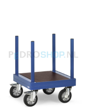 Het laadvlak is gemaakt van watervast multiplex en voorzien van antislip. De wagen is voorzien van 4 zwaarlast zwenkwielen (2 geremd) van elastisch streeploos rubber. Door de streeploze wielen is de wagen ook geschikt voor gebruik op gevoelige ondergronden. De naaf is met kogellager.