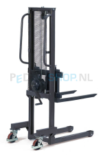 De stapelaar is voorzien van 2 zwenkwielen van polyurethaan (150 x 40 mm) en 2 vorkrollen van nylon (80 x 47 mm), de zwenkwielen zijn uitgevoerd met rem.